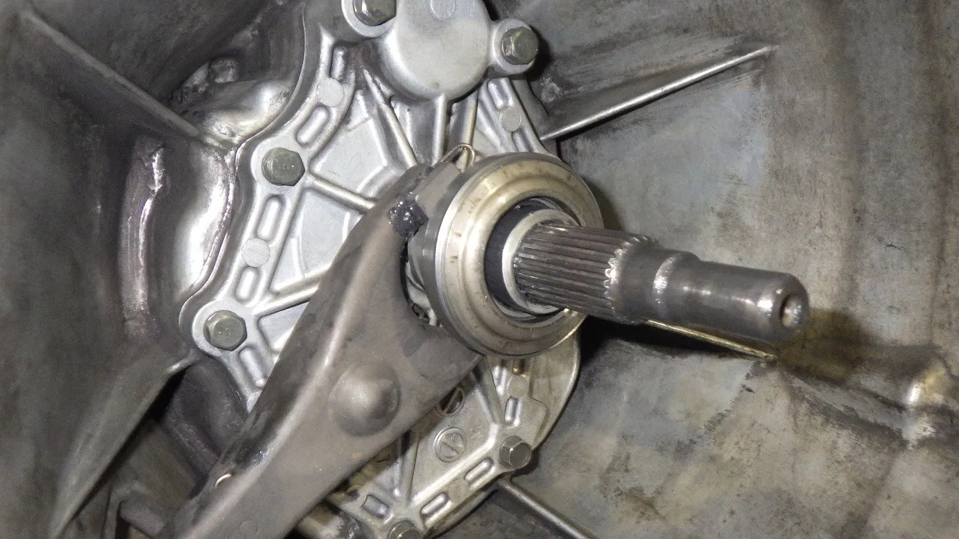 ミッション側にクラッチのダイアフラムを押すためのレリーズベアリング、レリーズフォークをグリスアップしながら組付けます。