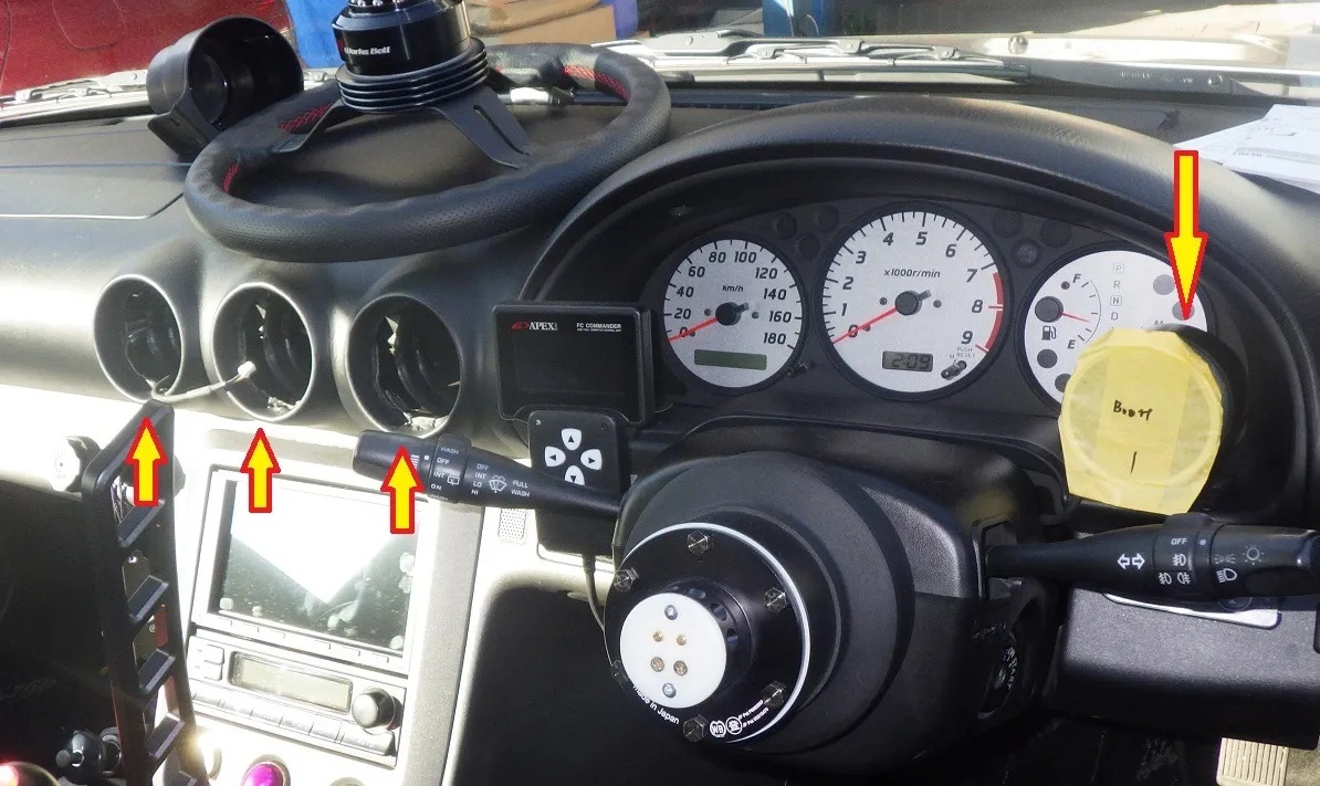 メーターはこんな感じで矢印部分に取り付けます。オーナー様の意向によりエアコンの吹き出し口を取外してメーターを埋め込みます。