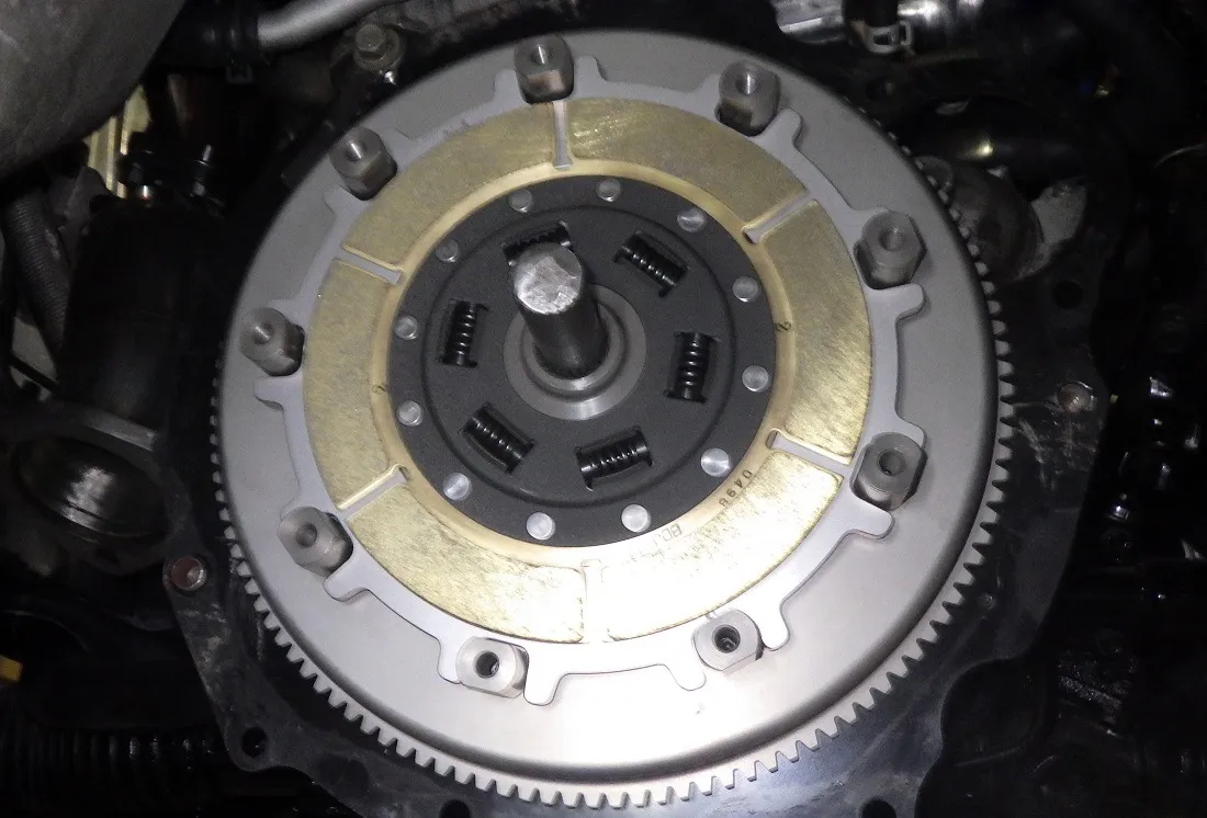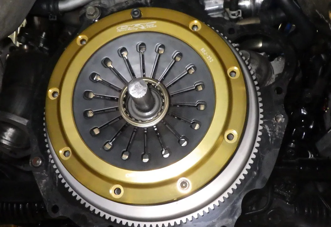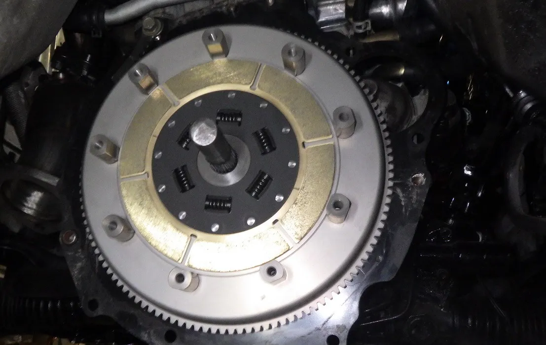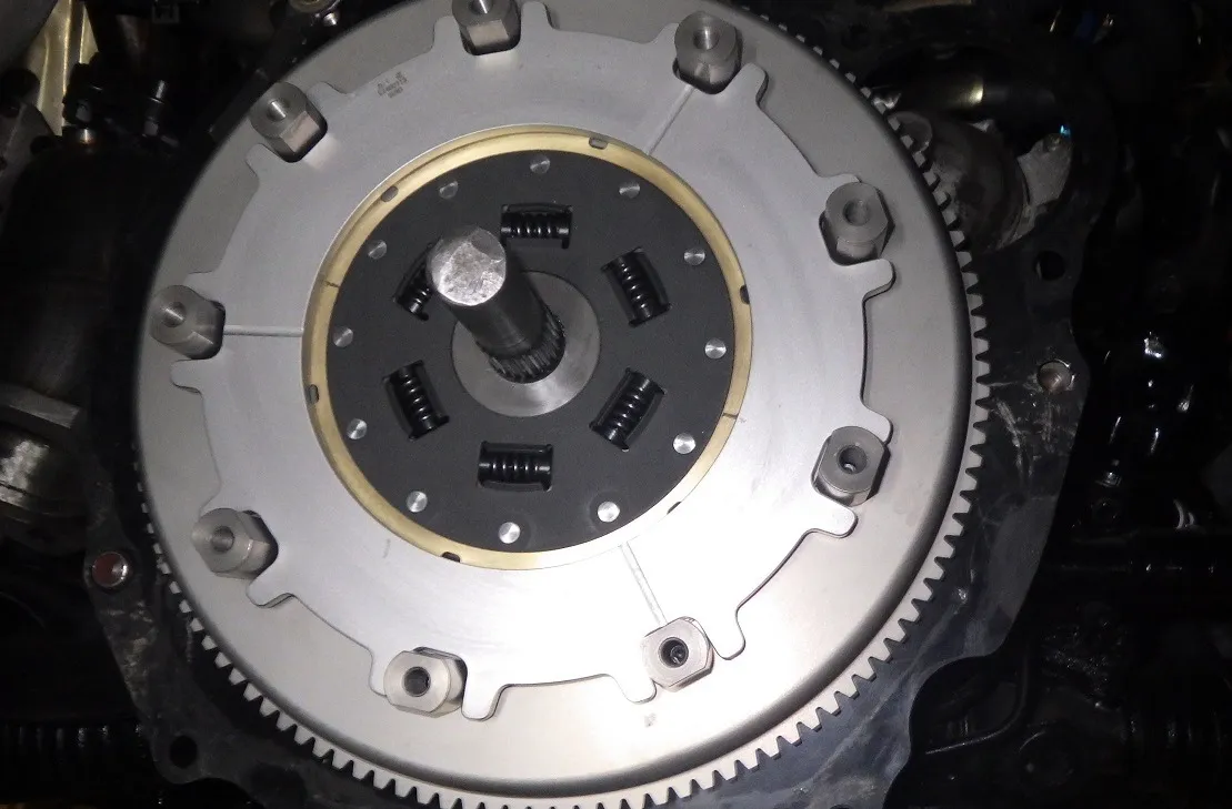 エンジンを載せたらまずはフライホイール、クラッチの取付ですね。