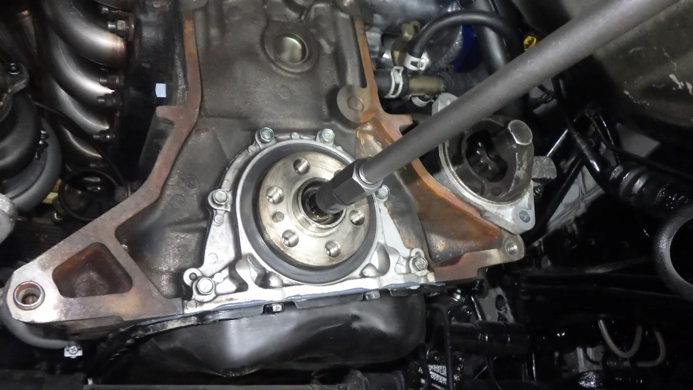 フライホイールをエンジンにセットして、しっかりトルク管理してボルトを締め込みます。